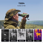 Boasting a 13mm lens with 8x digital zoom capability, and five color palettes including Bird, White Hot, Black Hot, Red Hot, and Fusion, the TS004 swiftly and accurately identifies targets in low light and complete darkness. It is powered by a high efficiency 5000mAh battery, offering over 11 hours of outdoor use without interruption. The IP67 plastic waterproof casing ensures protection against heavy rainfall, snow, mud, and other extreme weather conditions.